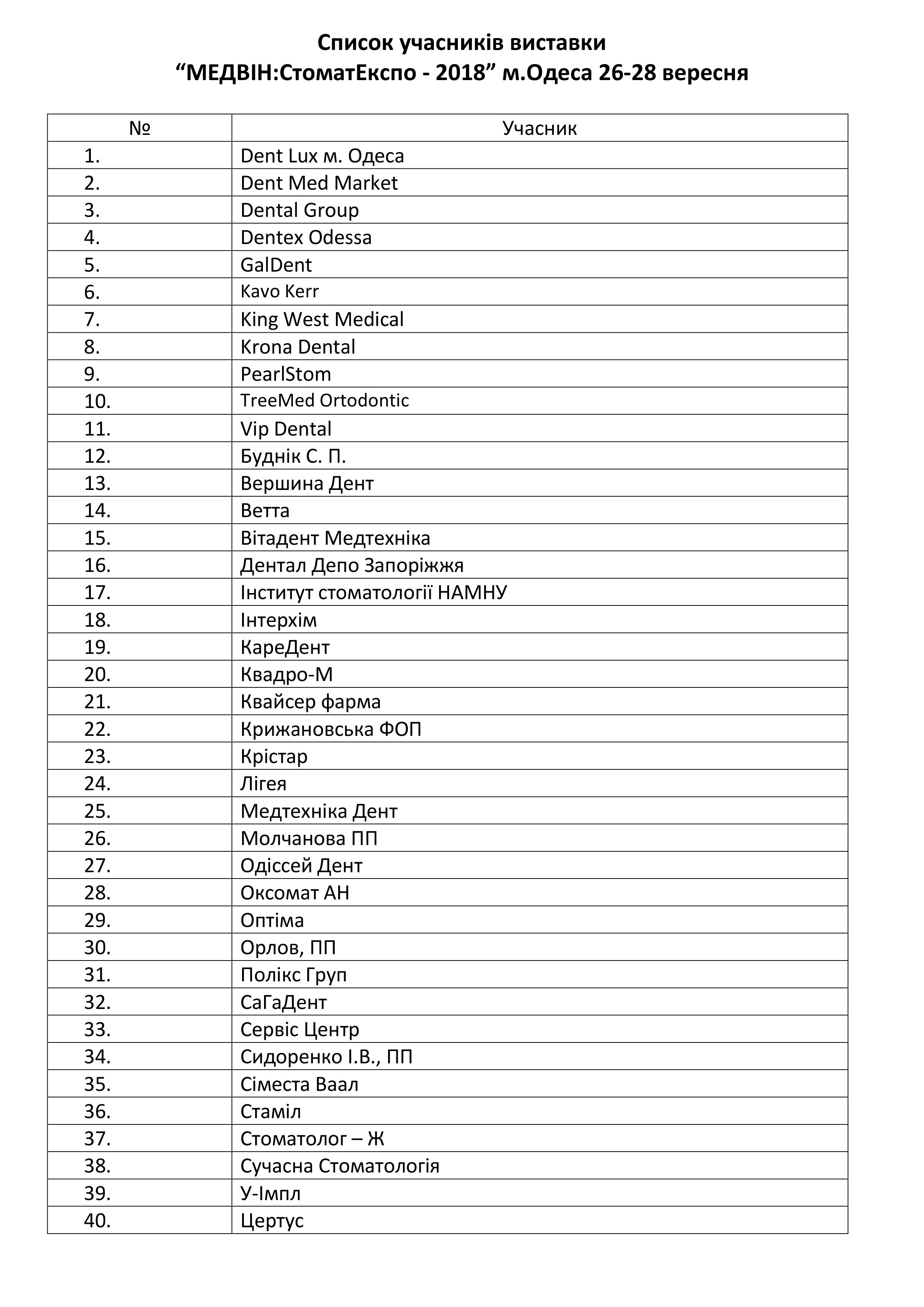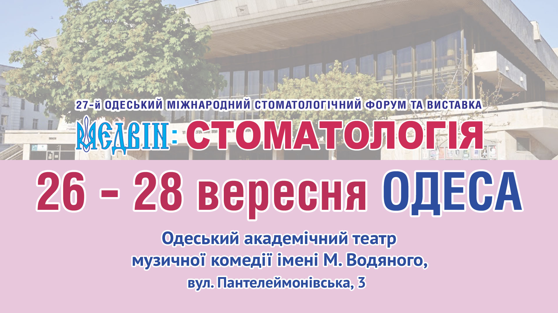 - Шановні стоматологи! Запрошуємо Вас на стоматологічну виставку МЕДВІН в ОДЕСІ, яка пройде 26 - 28 вересня в Одеському театрі музичної комедії по вул. Пантелеймонівській, 3. На виставці Вас чекають стоматологічні матеріали, інструменти та обладнання від понад 40 компаній-учасників виставки з Києва, Одеси, Харкова, Львова, Запоріжжя та Миколаєва.