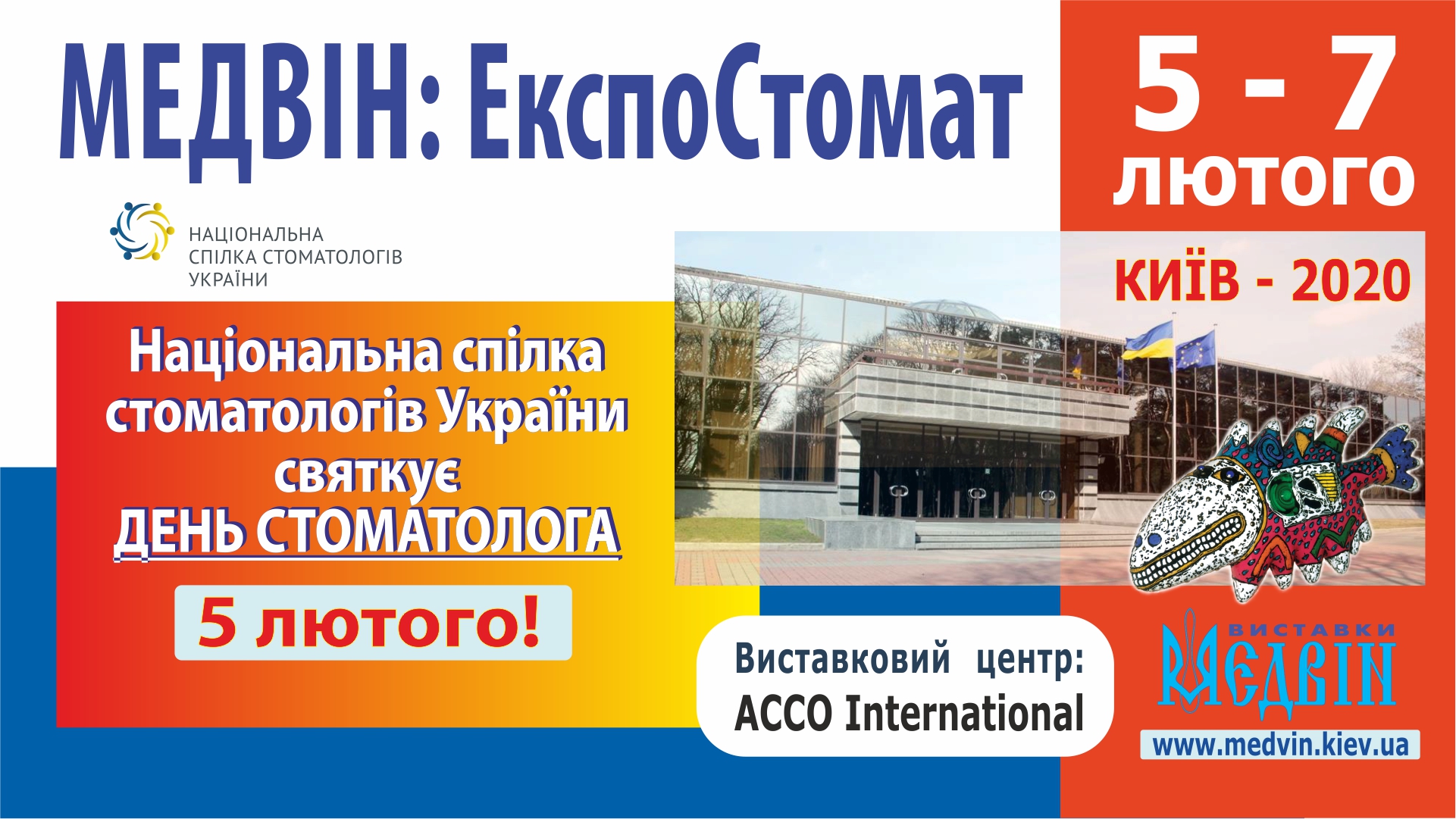 Шановні друзі та колеги! Запрошуємо долучатись до нашого заходу - 88-ої міжнародної спеціалізованої виставки "МЕДВІН: ЕкспоСтомат" та до святкування Всесвітнього Дня Стоматолога! - що пройдуть 5-7 лютого 2020 року у виставковому центрі «Акко Інтернешнл», у парку Пушкіна біля метро Шулявська (пр-т Перемоги 40-Б). На виставці більше 100 провідних компаній представлять стоматологічне та зуботехнічне обладнання, матеріали, інструменти, медичні вироби, медичний одяг,тощо.