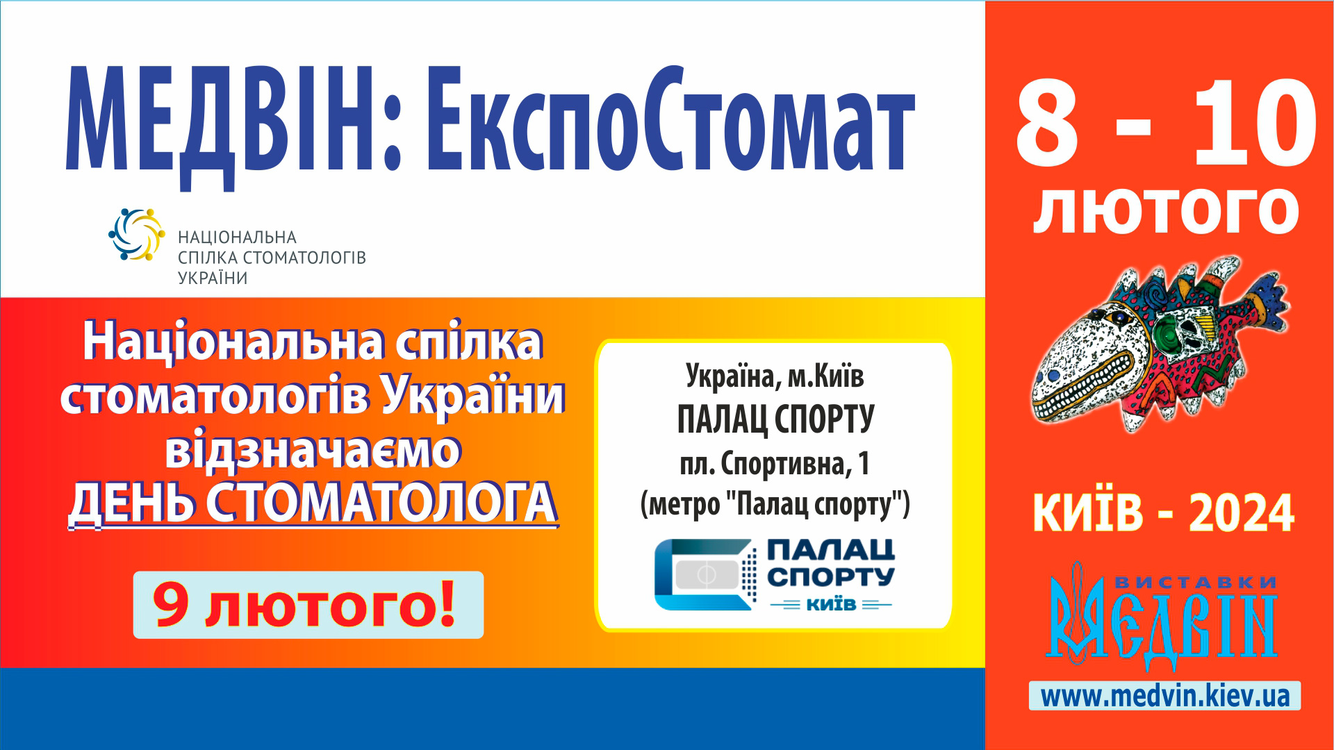 Шановні друзі та колеги! Запрошуємо долучатись до нашого заходу - 104-ої міжнародної спеціалізованої виставки "МЕДВІН: ЕкспоСтомат" та до святкування Всесвітнього Дня Стоматолога! - що пройдуть 8-10 лютого 2024 року у Палаці Спорту (Київ, Спортивна площа,1).