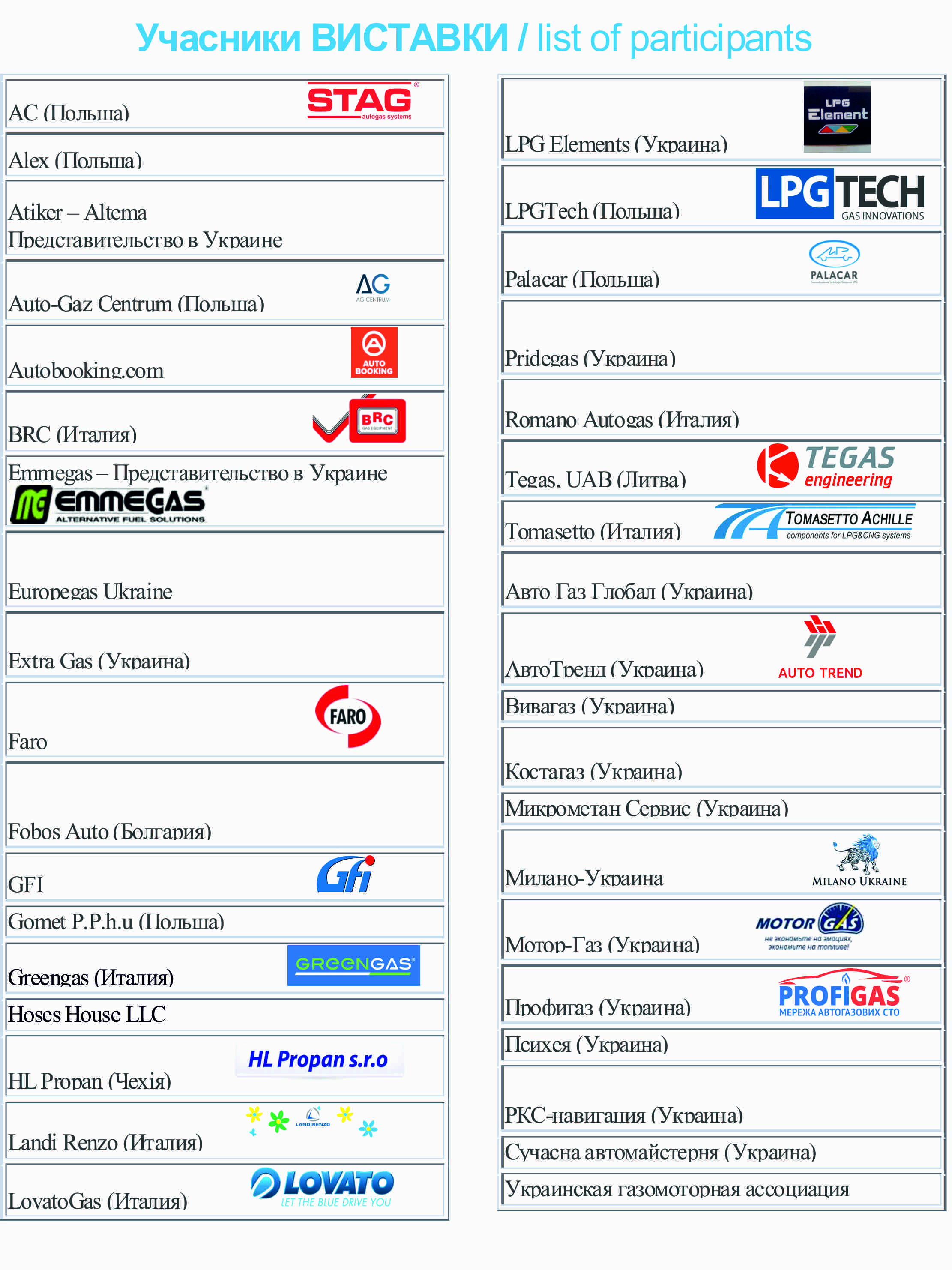 - УЧАСНИКИ: Виробники, імпортери та дистриб'ютори газобалонного обладнання • Виробники і дистриб'ютори техніки та обладнання для використання ЗВГ, КПГ і СПГ • Компанії, що займаються проектуванням, будівництвом і обладнанням об'єктів АЗС, АГЗС та АГНКС